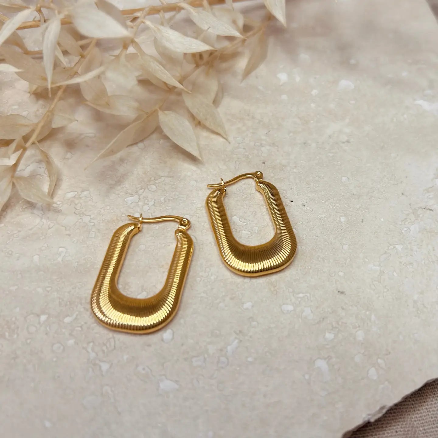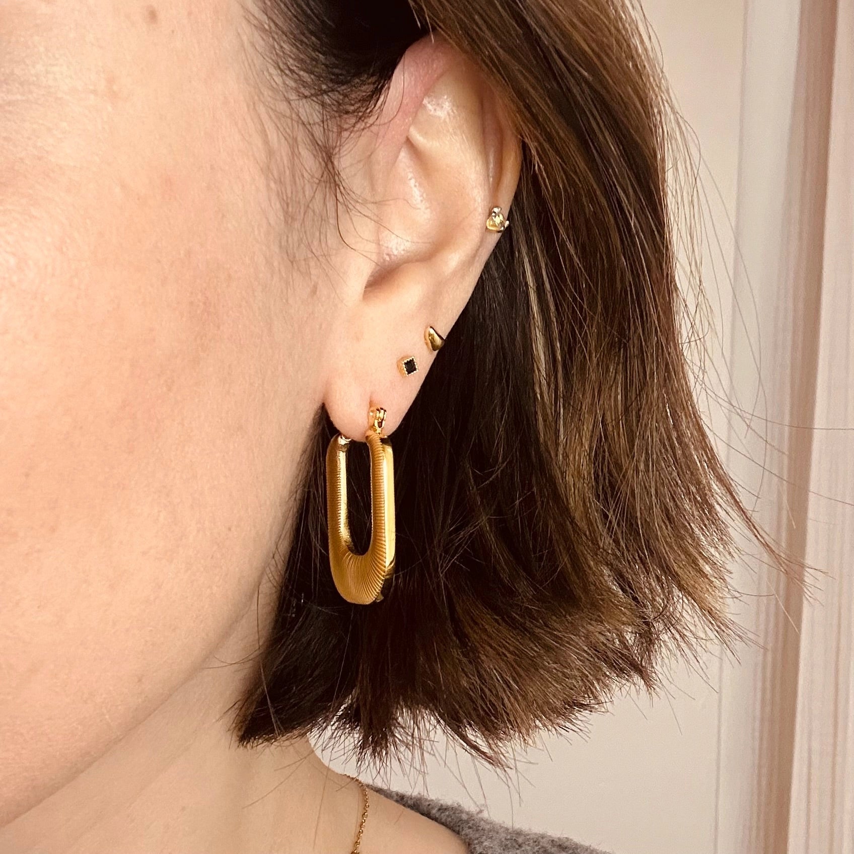 A vintage inspired, rounded square hoop, designed for you to wear all day. * Polished gold plated finish, thatwon’t fade or tarnish * Hypoallergenic, hard-wearing steel base for sensitive skin * Timeless design, made to be loved season after season * Water resistant, whilst we don’t recommend wearing any jewellery in water, this item will not discolour from contact with liquid.