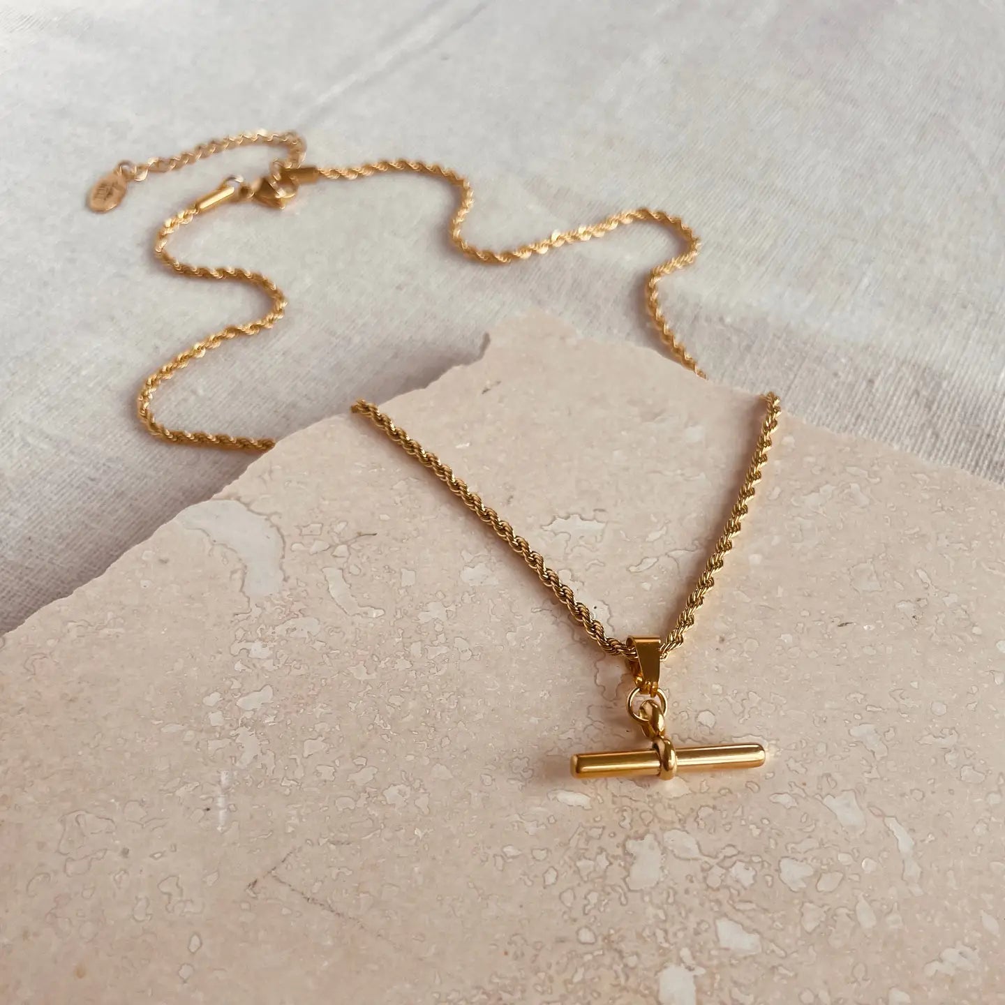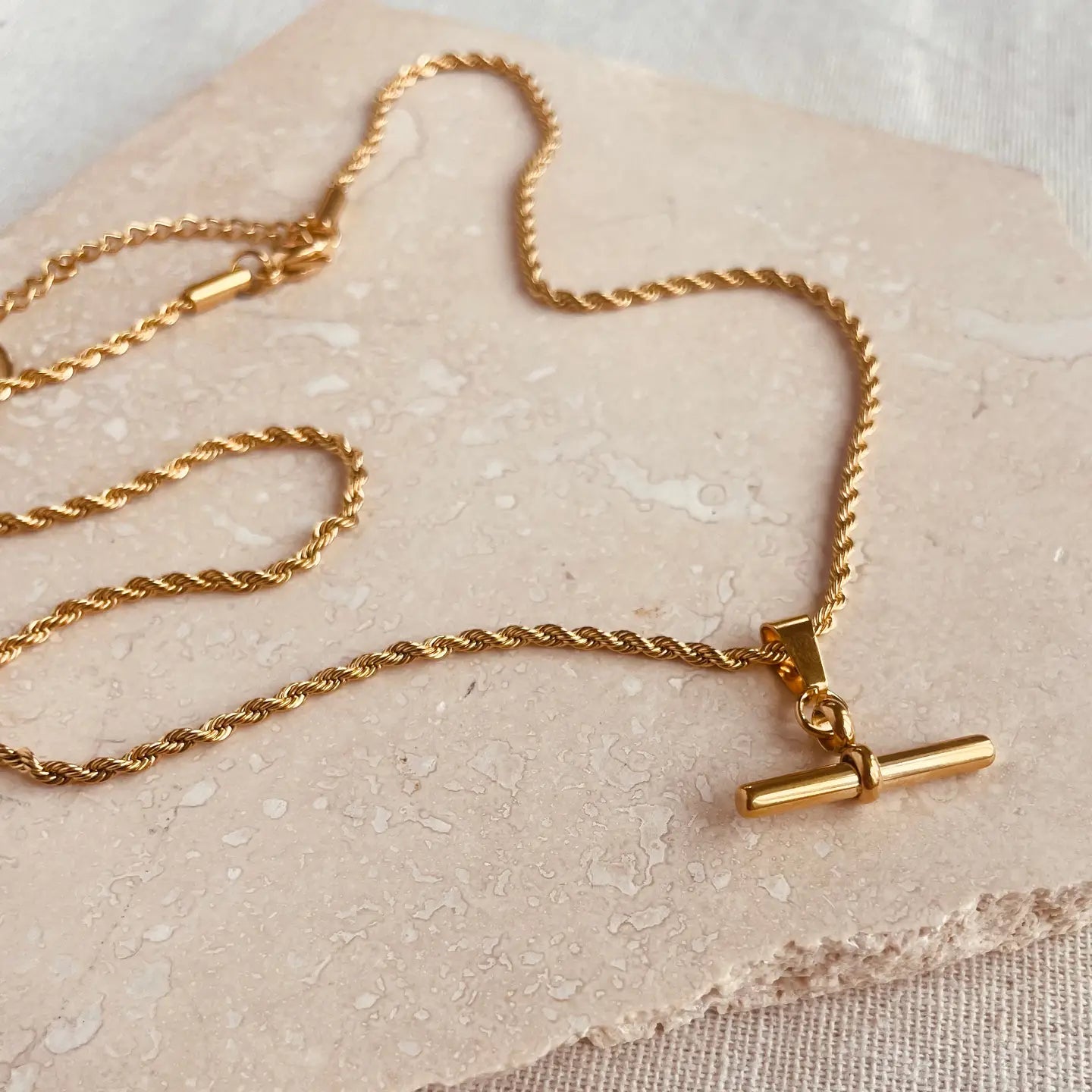 A timeless design that never goes out of style. The classic bar pendant on a twisted rope chain. * Polished gold plated finish, that won’t fade or tarnish * Chain is 40cm with a 5cm extender chain so you can wear at the length you like * Hypoallergenic, hard-wearing steel base for sensitive skin * Timeless design, made to be loved all year round. * Water resistant, whilst we don’t recommend wearing any jewellery in water, this item will not discolour from contact with liquid.